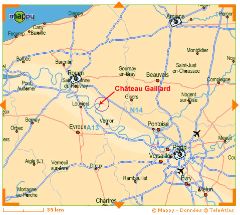 Château Gaillard est situé aux Andelys dans le département de l'Eure (27) en Haute-Normandie à 95km au nord-ouest de Paris en direction de Rouen.